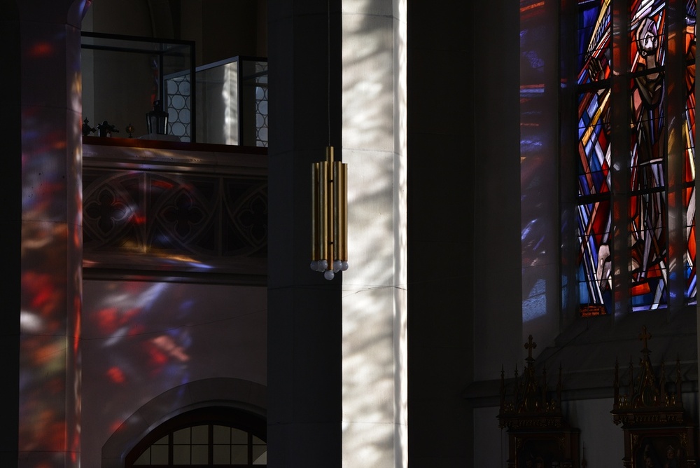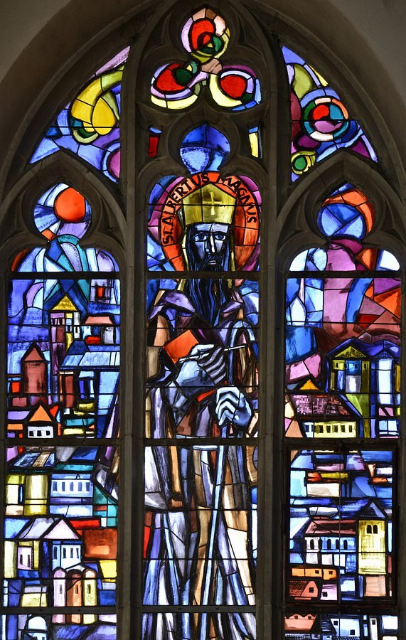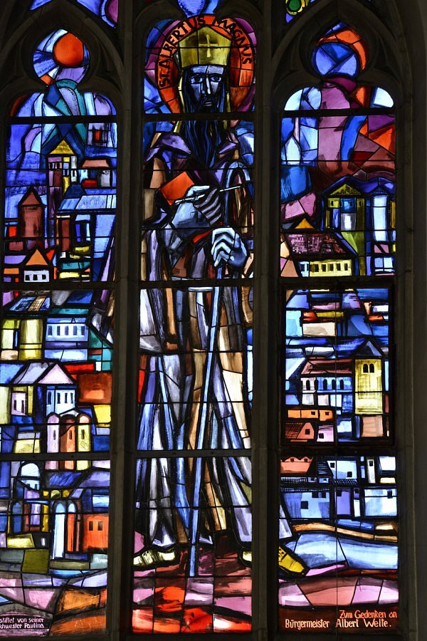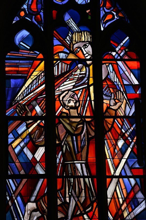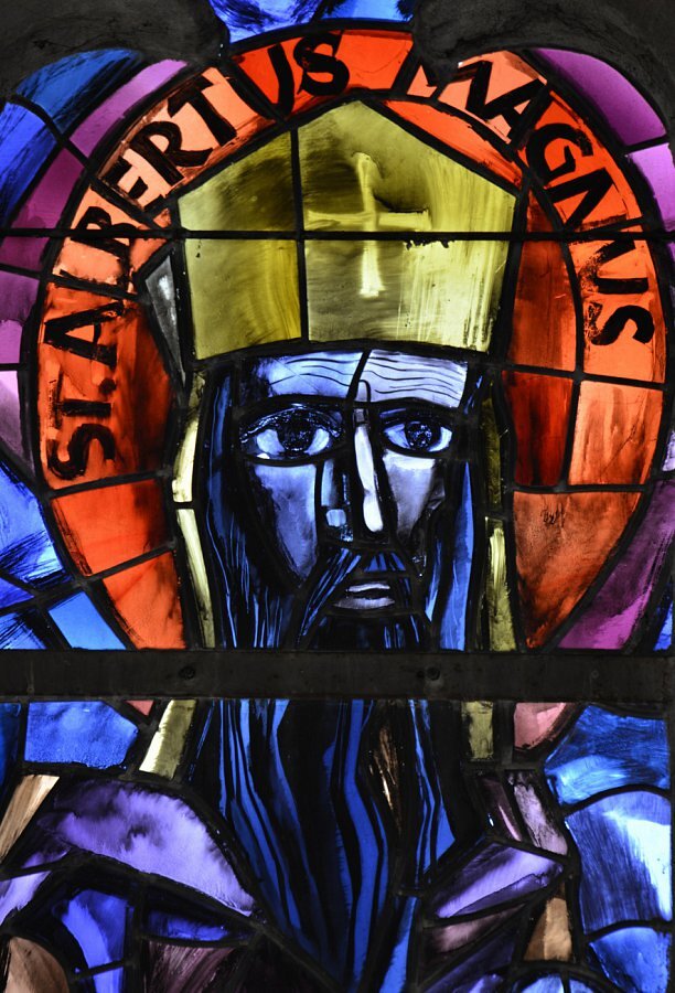Langhausfenster von Martin Häusle 1965, Engel mit hl. Franziskus, hl. Albertus Magnus