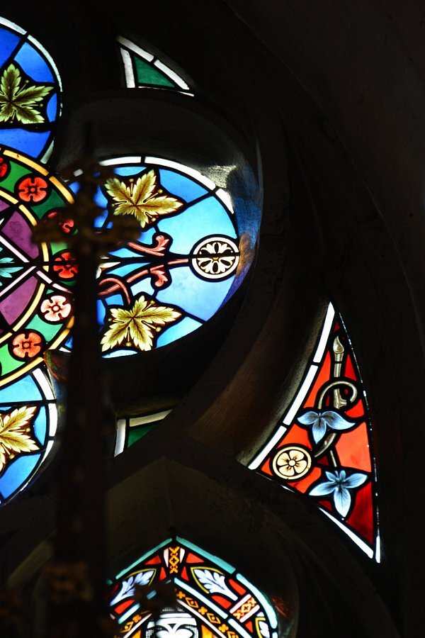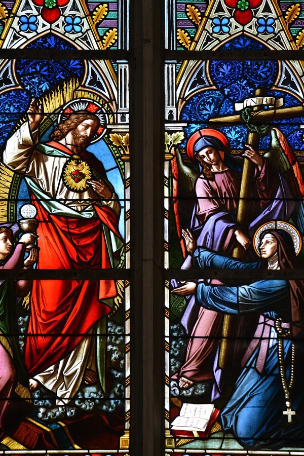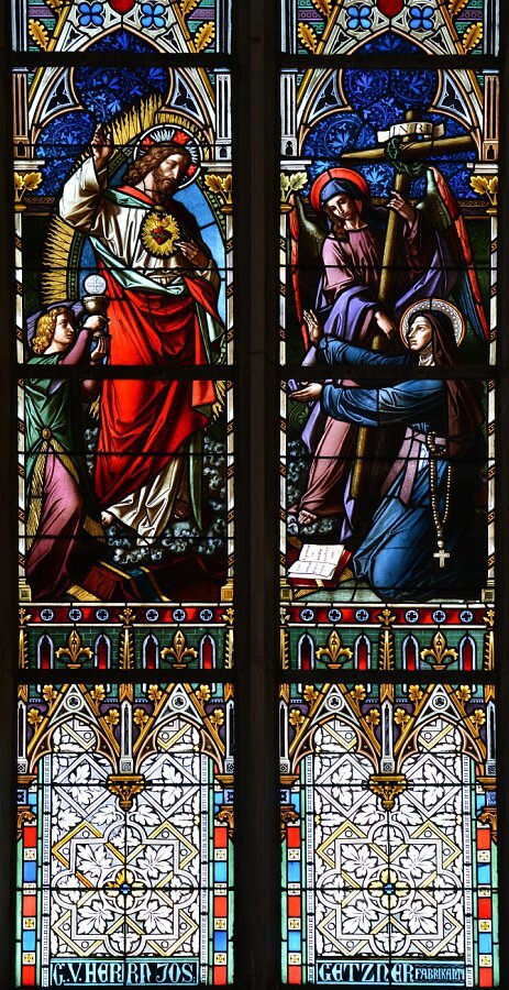 Glasgemälde im Chor; links Vermählung Mariä, rechts Christi Offenbarung an hl. Margaretha Alacoque, um 1890 Tiroler Glasmalereianstalt, Innsbruck